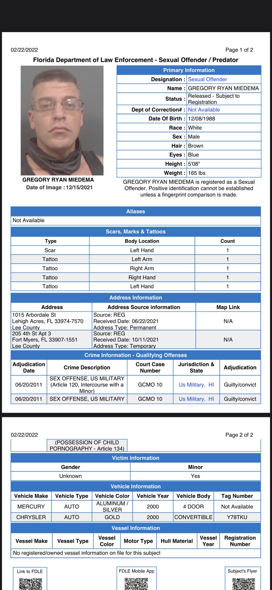 Who is Gregory Ryan Miedema? - LOVEBYLIFE Who is Gregory Ryan Miedema? Local authorities confirmed that Miedema is a registered sex offender, who was convicted in 2011 of serving in the US Army. He was found guilty of one count of sex with a minor and one count of possession of child pornography. Who is Gregory Ryan Miedema? - TodayHeadline Cops issued a blue alert shortly after 11:30 pm as they identified the suspected gunman as 33-year-old Gregory Ryan Miedema. 1 Gregory Ryan Miedema is wanted by Florida police Credit: Sarasota Police Department Who is Gregory Ryan Miedema? 1 hour ago · FLORIDA police have launched a manhunt after an officer was allegedly shot multiple times on Tuesday night. Cops issued a blue alert shortly after 11:30 pm as they identified the suspected gunman as 33-year-old Gregory Ryan Miedema. 1. Gregory Ryan Miedema is wanted by Florida police Credit: Sarasota Police Department. Florida Blue Alert issued for 33-year-old man in Taylor ... PERRY, Fla — Have you seen Gregory Miedema? The Florida Department of Law Enforcement has issued a Florida Blue Alert for Miedema, 33, last seen near U.S.-19 South Deer Run Road in Perry, Florida....